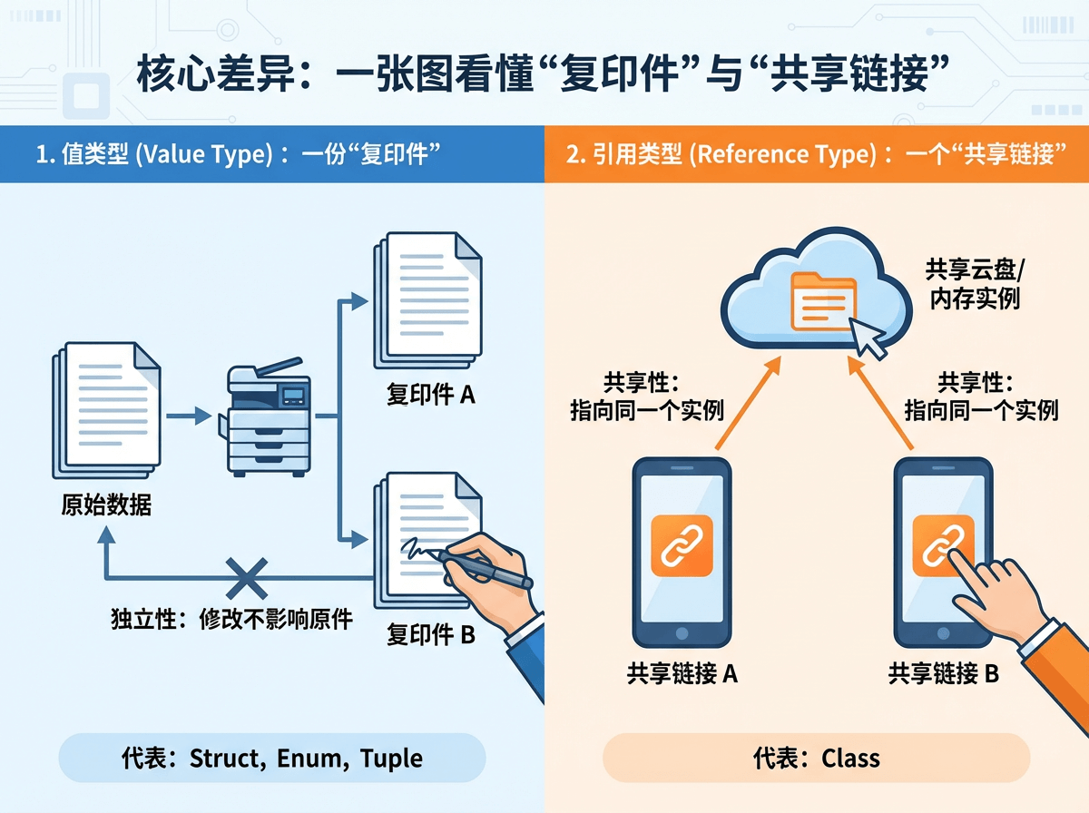 大家好,在刚开始学习 Swift 时,我像很多开发者一样,知道一个“简单”的区别:Struct 是值类型(Value Type),Class 是引用类型(Reference Type)。而 Enum 也是值类型。